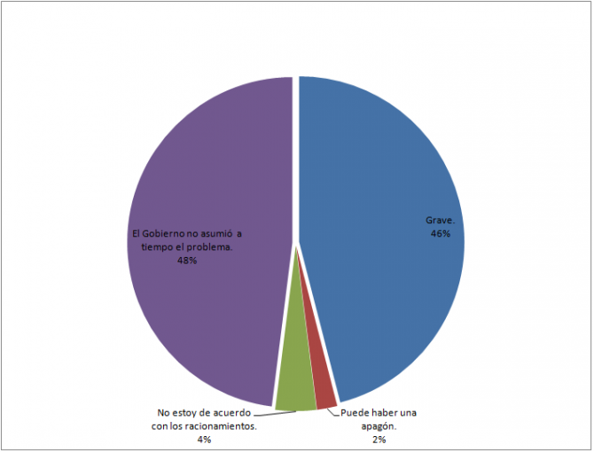 Un 46 por ciento calificó como grave la situación eléctrica, mientras que un 4 por ciento opinó que no está de acuerdo con los racionamientos y un 2 por ciento que puede haber un apagón.