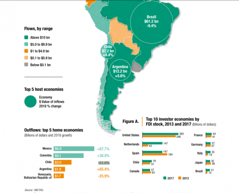 Las salidas de inversión de las empresas multinacionales de América Latina cayeron abruptamente en 2018, a un mínimo de 6.500 millones de dólares, en la medida en que las filiales extranjeras de las empresas brasileñas repatriaron recursos financieros y que las inversiones de Chile se replegaron. Sin embargo, las inversiones procedentes de Argentina, Colombia y México aumentaron.