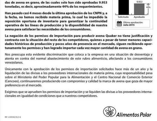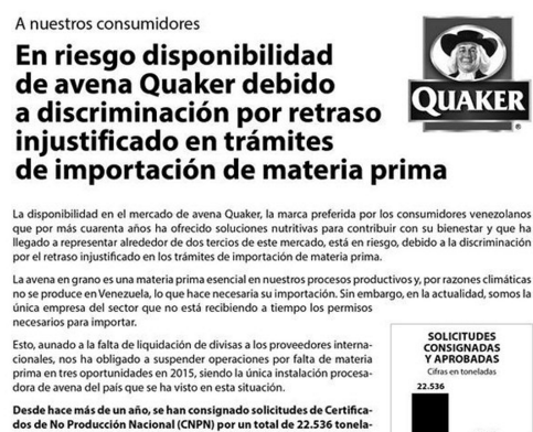 El mismo informa, que la marca Quaker surte dos tercios del mercado, y que ha ha debido suspender tres veces las operaciones en lo que va de año, debido a los retrasos en la aprobación para importar materia prima.