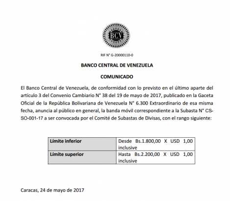 El Banco Central de Venezuela (BCV) fijó la banda de la primera subasta del nuevo Sistema de Divisas de Tipo de Cambio Complementario Flotante de Mercado (Dicom) que fue convocada este jueves y cerrará el viernes a las 6 de la tarde.