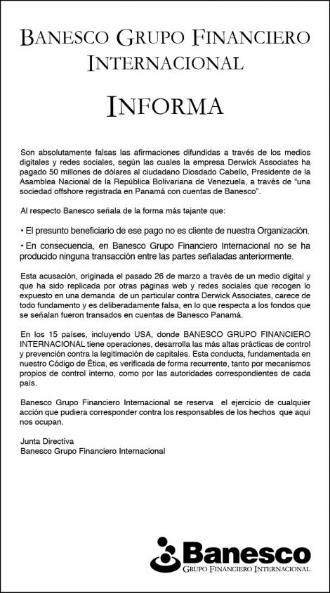 Banesco Grupo Financiero Internacional emitió un comunicado para desmentir las afirmaciones difundidas que aseguran que la empresa Derwick Associates ha pagado 50 millones de dólares al presidente de la Asamblea Nacional, Diosdado Cabello, a través de "una sociedad offshore registrada en Panamá con cuentas de Banesco".