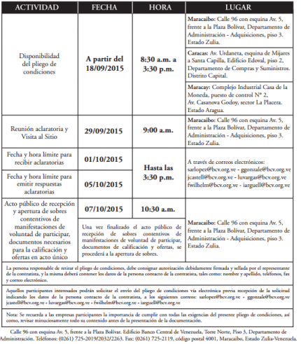 Hizo saber el BCV a las empresas interesadas en participar que para el presente concurso deberán atender el siguiente cronograma de actividades: