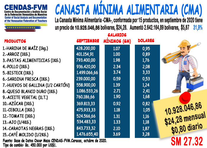 Según el estudio, la canasta alimentaria mínima alimentaria conformada por 15 productos tiene un precio de 10,9 millones de bolívares o 24,28 dólares en septiembre, un aumento de 2,6 millones de bolívares. En agosto, el precio fue de 8,2 millones de bolívares.