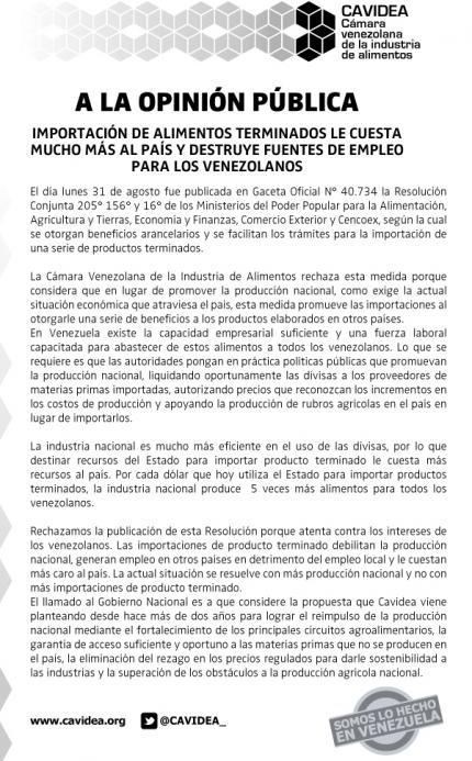 La Cámara Venezolana de Alimentos (CAVIDEA) manifestó su rechazo por la decisión del Ejecutivo nacional de otorgar beneficios arancelarios y facilitar los trámites para la importación de una serie de productos terminados, tal como salió publicado en Gaceta Oficial el pasado 31 de agosto.