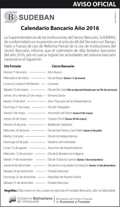 La Superintendencia de las Instituciones del Sector Bancario (Sudeban) publicó el martes el calendario bancario del 2016.