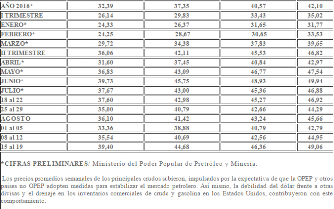 El crudo venezolana subió 3,86 dólares el barril y se ubicó en 39,40 dólares el barril en la semana finalizada al 19 de agosto ante la posibilidad de la reducción de producción, informó el ministerio de Petróleo.