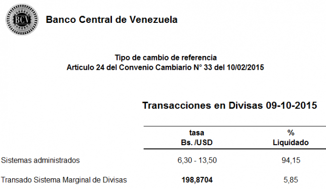 Este sistema representó el 5,85 % de lo liquidado, mientras que los sistemas administrados de 6,30 bolívares por dólar y Sicad de 13,50 bolívares por dólar significó el 94,15%.