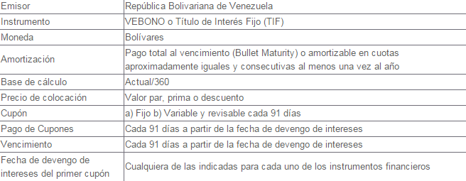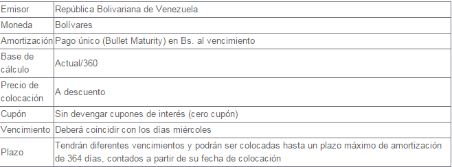 A través de la Septuagésima Octava Emisión (78) de Letras del Tesoro, hasta un máximo en circulación al cierre del Ejercicio Económico Financiero 2016, 31.636.500.000 bolívares.
