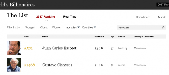 Forbes incluyó como segundo millonario a Gustavo Cisneros con una fortuna de 1.380 millones de dólares y en la lista global se ubica en el puesto 1.500, muy lejos de Escotet. Sin embargo, la fortuna de Cisneros se redujo a 1.380 millones de dólares desde los 2.000 millones de dólares que obtuvo en el 2016.