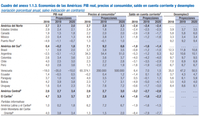 Las proyecciones para la región la sitúan por debajo del promedio de la economía mundial, que según el organismo crecerá un 3 por ciento en 2019 y un 3,4 por ciento en 2020.