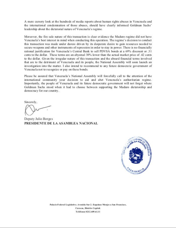 "Como presidente de la Asamblea Nacional me encuentro preocupado e indignado porque Goldman Sachs ha decidido adquirir 2.800 millones de dólares en bonos al dictador Nicolás Maduro, lo cual provee un salvavidas a un régimen autoritario que viola sistemáticamente los derechos de los venezolanos", se lee en una carta abierta de Borges a Lloyd Blankfein, director ejecutivo de una de las bancas de inversión y valores más grandes del mundo.