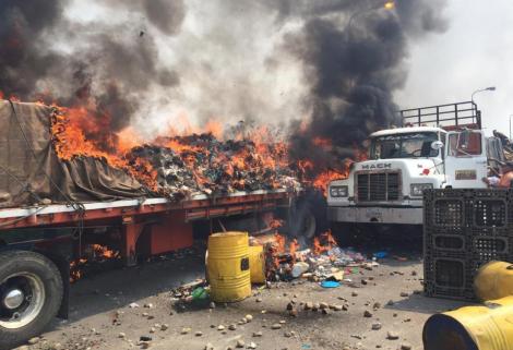 Dos camiones repletos de ayuda humanitaria fueron incendiados este sábado en un puente en la frontera entre Colombia y Venezuela, cuando los militares venezolanos bloqueaban el paso de una caravana de cuatro furgones y lanzaban bombas lacrimógenas contra manifestantes.