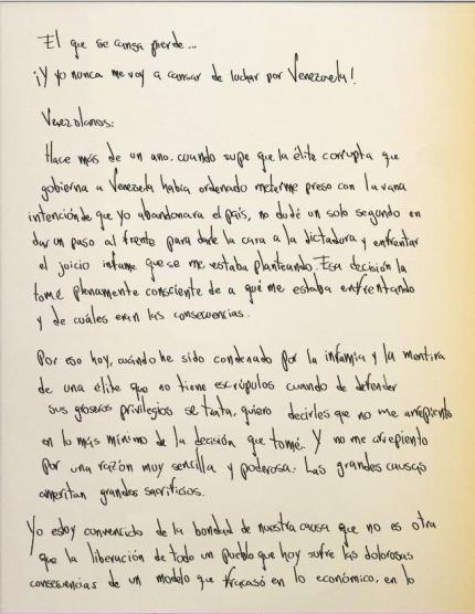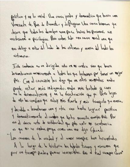 "El que se cansa pierde y yo no me canso de luchar por Venezuela", expresó en la carta que escribió luego de la sentencia que recibió el jueves en el Palacio de Justicia.