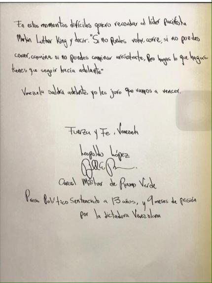 "Les prometo que muy pronto viviremos en la mejor Venezuela", fue la promesa que dejó en su escrito el líder opositor Leopoldo López luego de ser condenado el jueves a casi 14 años de prisión en la cárcel militar de Ramo Verde.