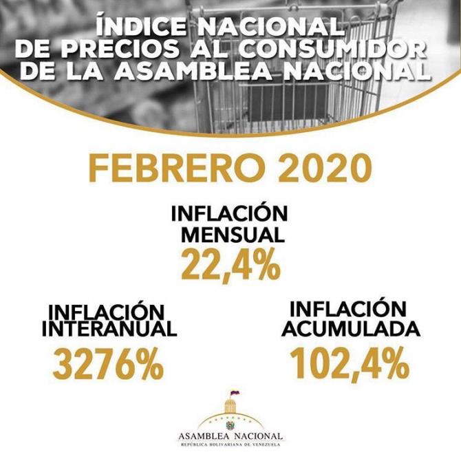 En los primeros dos meses del año 2020, la inflación se ubicó en 102,4 por ciento, de acuerdo a los datos suministrados por la Asamblea Nacional.