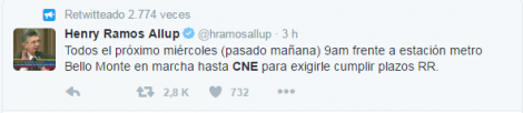 “El miércoles nos movilizaremos todos al CNE para pedirle a la señora Tibisay Lucena que haga su trabajo!”, escribió el diputado José Manuel Olivares.
