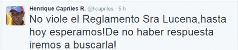 “No viole el Reglamento señora Lucena, hasta hoy esperamos. De no haber respuesta iremos a buscarla”, sentenció Henrique Capriles a través de su cuenta en Twitter.