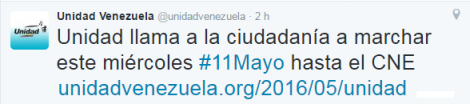 Los líderes de la MUD desde sus cuentas sociales han instado a la población a manifestarse el miércoles, 11 de mayo.
