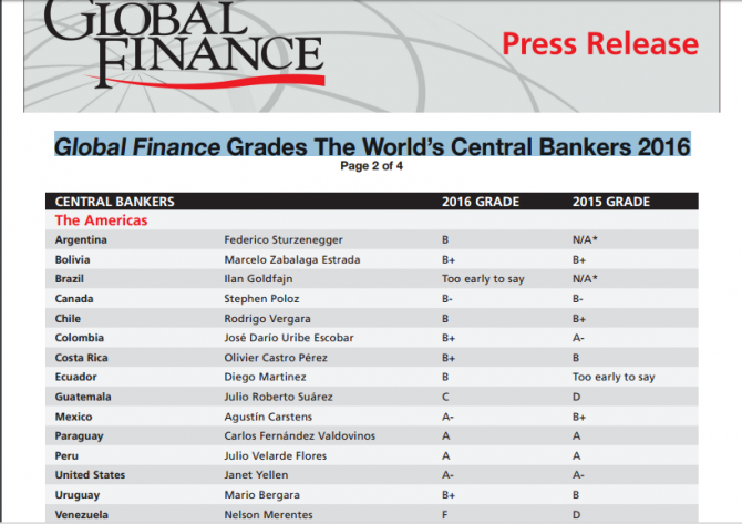 “Los bancos centrales enfrentan desafíos sin precedentes, convulsiones políticas, así como los bajos precios de materias primas. Es por ello que las políticas monetarias deben ser prudentes, para poder mitigar los impactos negativos. El (ranking) muestra como resultado que algunos banqueros centrales están más limitados por circunstancia que otros, mientras que algunos han demostrado una notable agilidad”, explicó Joseph Giarraputo, editor de Global Finance.