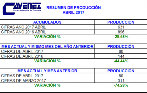 El gremio automotriz reporta que las tres ensambladoras que están operativas como FCA Venezuela, Mack de Venezuela y Toyota lograron ensamblar 80 vehículos en abril, una caída de 29,58 por ciento con respecto al mismo período del 2016, y una caída de 74,28 por ciento con respecto al mes anterior al producir solo 81 unidades frente a las 311 del mes anterior.