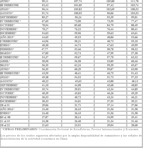 Según el informe, en lo que va de año el precio promedia 24,40 dólares por barril menor a los 44,65 dólares de 2015, es decir unos 20 dólares menos.