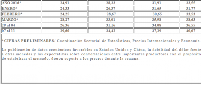 “La publicación de datos económicos favorables en Estados Unidos y China, la debilidad del dólar frente a otras monedas y las expectativas sobre conversaciones entre importantes productores con el propósito de estabilizar el mercado, dieron soporte a los precios durante la semana”, afirma el portal del Ministerio del Petróleo.