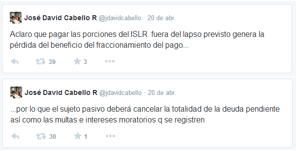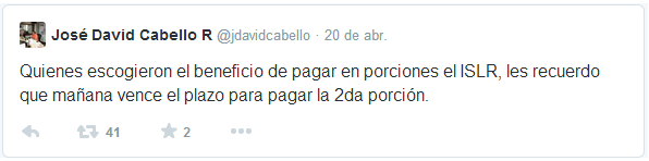 El superintendente Nacional Aduanero y Tributario, José David Cabello, recordó este domingo a través de la red social Twitter que el lapso para realizar el depósito de la segunda parte del tributo vence este lunes.