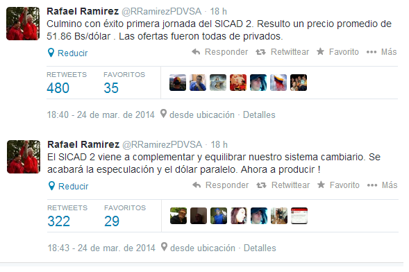 A través de su cuenta su cuenta en la red social Twitter (@RRamirezPDVSA), el también ministro de Petróleo y Minería ratificó su respaldo al nuevo mecanismo y reiteró que el objetivo de este el equilibrar el sistema cambiario nacional.