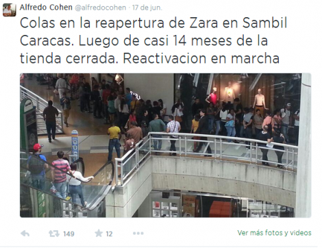 “Hoy reabre Zara en Sambil Caracas. Luego de 14 meses de cierre. Reactivacion parcial de Grupo Inditex. Es una buena noticia”, afirmó.