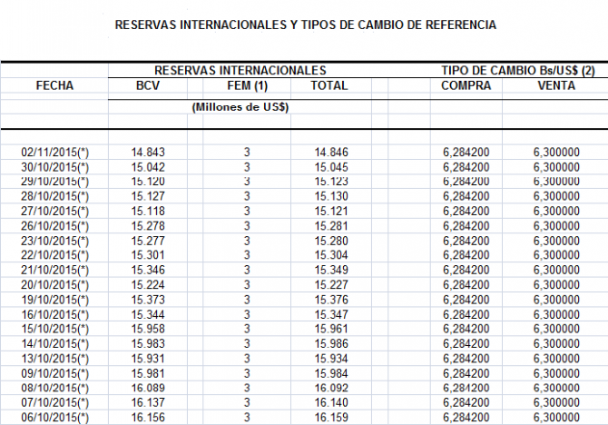Las reservas internacionales de Venezuela bajaron al mismo nivel en el que se encontraban en 2003, según el Banco Central de Venezuela. Sin embargo, esto acontece en medio del pago de compromisos internacionales y de un precio del barril de petróleo por debajo de los $40.