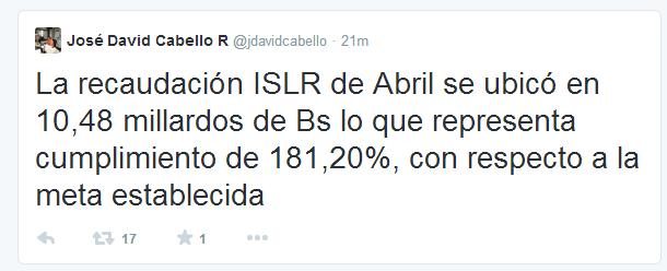 En relación al Impuesto Sobre La Renta, Cabello informó que se ubicó en 10,48 millardos de bolívares lo que representa un cumplimiento del 181,20 por ciento con respecto a la meta fijada en 5,78 millardos de bolívares.