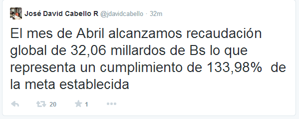 José David Cabello, superintendente del Seniat, informó que durante el pasado mes de abril se logró recaudar 32,06 millardos de bolívares, lo que representa un cumplimiento de 133,98 por ciento de la meta global establecida para este mes.