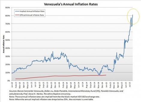 El economista estadounidense Steve H. Hanke advirtió que la inflación en Venezuela anual se ubicó en 615%, entre agosto de 2014 y julio de 2015 y resaltó que la economía del país ya ingresó "en una espiral de la muerte”.