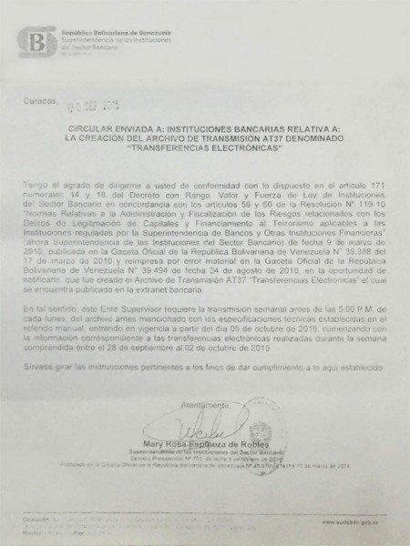 La circular emitida a los bancos señala que "fue creado el archivo de transmisión AT37 "Transferencias electrónicas" el cual se encuentra publicado en la extranet bancaria.