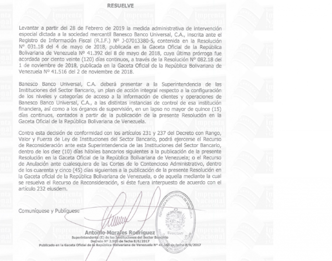 "Banesco Banco Universal, C.A. deberá presentar a la Superintendencia de las Instituciones del Sector Bancario, un plan de acción integral respecto a la configuración de los niveles y categorías de acceso a la información de clientes y operaciones de Banesco Banco Universal, C.A., a las distintas instancias de control de esa institución financiera, así como a los órganos de supervisión, en un lapso no mayor de 15 días continuos contados a partir de la publicación de la presente resolución en la Gaceta Oficial", se lee en la resolución publicada en la Gaceta Oficial con fecha del 27 de febrero.