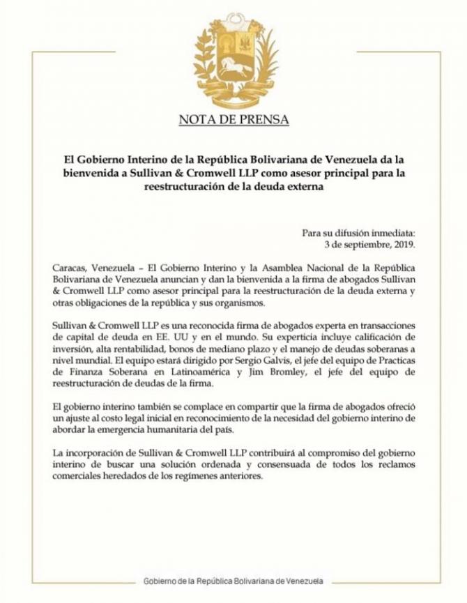 El bufete de abogados estadounidense Sullivan & Cromwell LLP será el principal asesor de la oposición de Venezuela para el proceso de reestructurar la deuda externa del país, dijo el martes el representante legal en el extranjero del líder opositor Juan Guaidó.