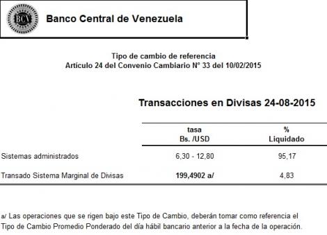 El BCV igualmente publicó que el porcentaje transado hoy por este nuevo esquema cambiario representa el 4,83% de las divisas, mientras que el otro 95,17% sigue liquidándose en los otros dos mercados, el de Bs 6,30 y el de Bs 12,80.