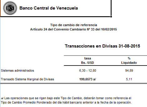 Igualmente informó el ente gubernamental que el porcentaje transado hoy por este nuevo esquema cambiario representa el 5,11% de las divisas, mientras que el otro 94,89% sigue liquidándose en los otros dos mercados, el de Bs 6,30 y el de Bs 12,80.