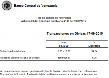 El BCV igualmente publicó que el porcentaje transado hoy por este nuevo esquema cambiario representa el 5,36% de las divisas, mientras que el otro 94,64% sigue liquidándose en los otros dos mercados, el de Bs 6,30 y el de Bs 13,50.