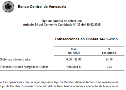 El BCV igualmente publicó que el porcentaje transado hoy por este nuevo esquema cambiario representa el 5,25% de las divisas, mientras que el otro 94,75% sigue liquidándose en los otros dos mercados, el de Bs 6,30 y el de Bs 13,50.