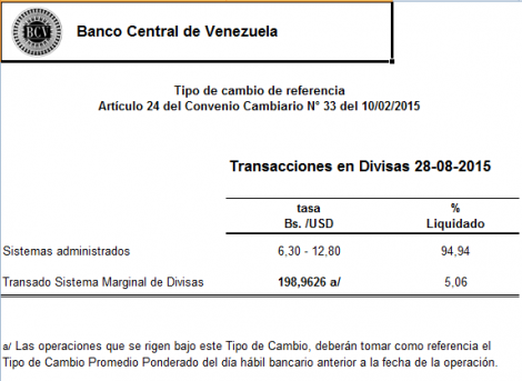 El Banco Central de Venezuela publicó este viernes el tipo de cambio de referencia del Sistema Marginal de Divisas (Simadi), ubicándose en Bs. 198,9626 por dólar.