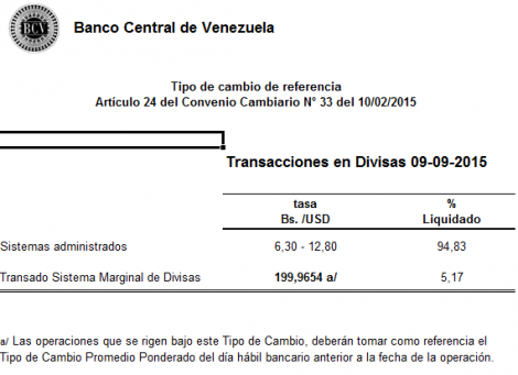 El BCV igualmente publicó que el porcentaje transado hoy por este nuevo esquema cambiario representa el 5,14% de las divisas, mientras que el otro 94,83% sigue liquidándose en los otros dos mercados, el de Bs 6,30 y el de Bs 13,50.
