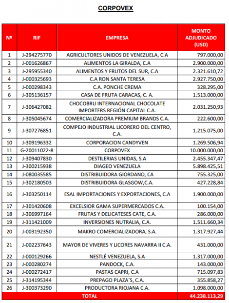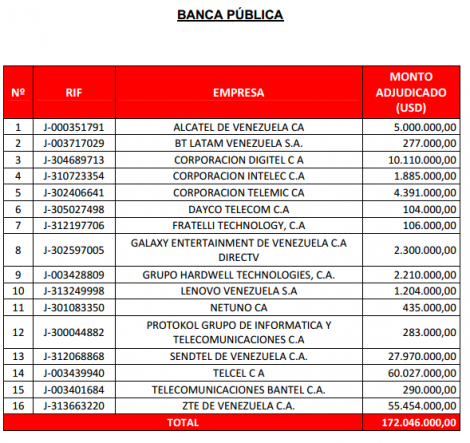En total, 16 empresas del sector telecomunicaciones recibirán más de 172 millones de dólares. En cuanto a los otros dos sectores convocados el pasado 28 de julio, fueron adjudicados más de $20,7 millones para el sector alimentos y más de $13,4 millones para el sector de bebidas alcohólicas.
