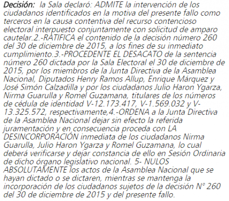 La Sala Electoral del TSJ aceptó la denuncia de los diputados oficialistas por este caso y declaró en desacato a la AN, por lo cual consideró sin lugar todas sus actuaciones.