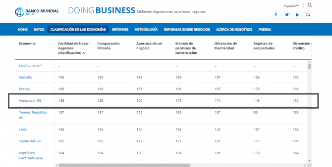 Venezuela ocupó una de las últimas posiciones del mundo y de América Latina en la clasificación internacional de Doing Business del Banco Mundial, el índice de la facilidad para hacer negocios. De acuerdo a los datos, Venezuela llegó a la posición 188, a tan sólo dos peldaños del último escalafón que arrojó para Somalia en materia de negocios.