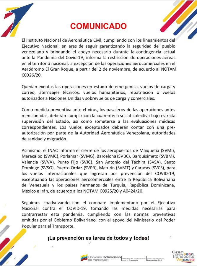 El Instituto Nacional de Aeronáutica Civil (INAC) informó que fueron autorizados los vuelos comerciales hacia República Dominicana, Turquía, México e Irán, sin precisar fecha. Mientras que a nivel nacional sólo están autorizados los vuelos para la isla de Los Roques.