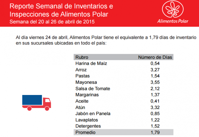 Al día viernes 24 de abril, Alimentos Polar tiene el equivalente a 1,79 días de inventario en sus sucursales ubicadas en todo el país, según informó en su último reporte publicado en su página web.