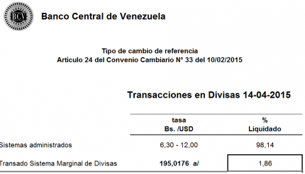 El BCV informó también que en las transacciones del Simadi atendió el 1,86 por ciento de la demanda de divisas, mientras que la tasa de 6,30-12 bolívares por dólar, representó el 98,12 por ciento de lo liquidado.