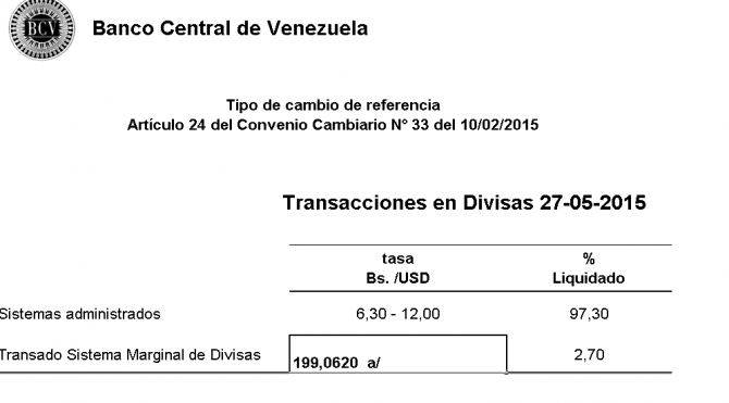 Según informó el Banco Central de Venezuela (BCV), el Simadi representó el 2,70 por ciento de lo liquidado en divisas. Sin embargo, el dólar Cencoex (6,30 bolívares) y el Sicad, según el emisor representa el 97,30 por ciento.