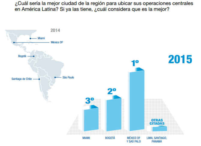 “México DF gana brillo como sede para ubicar las operaciones centrales de las empresas españolas, igualando a Sao Paulo, que era la metrópoli más atractiva, seguidas ambas por Bogotá y por Miami”, se lee.